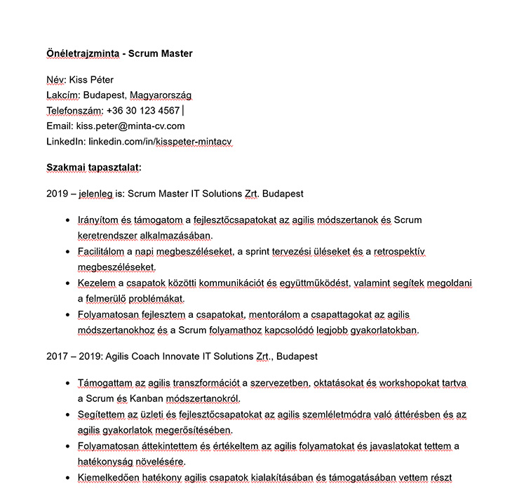 Scrum master önéletrajz: a CV-re kattintva a teljes minta letölthető