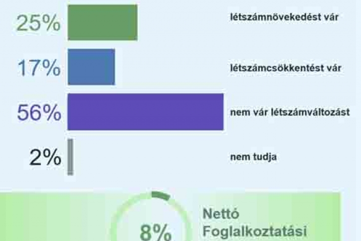 A létszámnövekedést, illetve -csökkenést előrejelző cégek számának különbségéből származtatott, szezonálisan kiigazított Nettó Foglalkoztatási Mutató (NFM) +8 százalékos...