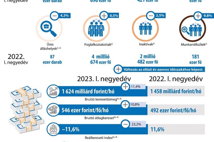 A foglalkoztatottak átlagos létszáma a 15–74 éves népességen belül 4 millió 696 ezer fő volt, 21 ezerrel több, mint 2022 I. negyedévében. A munkanélküliek száma 18 ezer fővel, 199 ezer főre nőtt. A potenciálisan rendelkezésre álló munkaerő nagysága nem, de az összetétele változott. Csökkent a pótlólagos munkaerő iránti kereslet. A keresetek vásárlóereje a magas infláció miatt visszaesett - derül ki a KSH negyedéves elemzéséből.