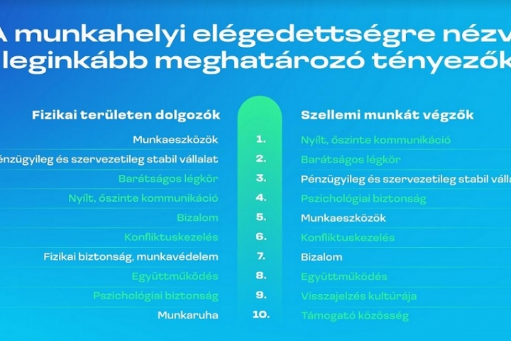 A munkahelyi elégedettséget meghatározó tényezők toplistáján meglepő a közösséghez és kommunikációhoz kapcsolódó elemek túlsúlya: szellemi munkavállalóknál tízből nyolc, a fizikai munkát végzőknél hat fontos elvárás ide sorolható. Váratlan, hogy a nemzetköziség vagy márkaismertség nincs a legattraktívabb hívószavak között, de a szakmai fejlődés is csak minden ötödik munkavállalót motivál.